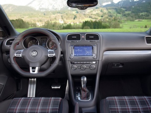 Top speed is 235 kph (DSG models). This machine makes the Golf GTI VW Golf Cabrio become the most powerful. 2013 Volkswagen Golf GTI Cabriolet interior and exterior styling tweaks as well. That means the red-accented grille and honeycomb iconic GTI badge, as well as honeycomb treatment for portions of the lower fascia. Has sport seats upholstered classic tartan ‘Jacky’. GTI badge is working to the top of the backrests. Leather seats are available as options (cool skin ‘Vienna’).